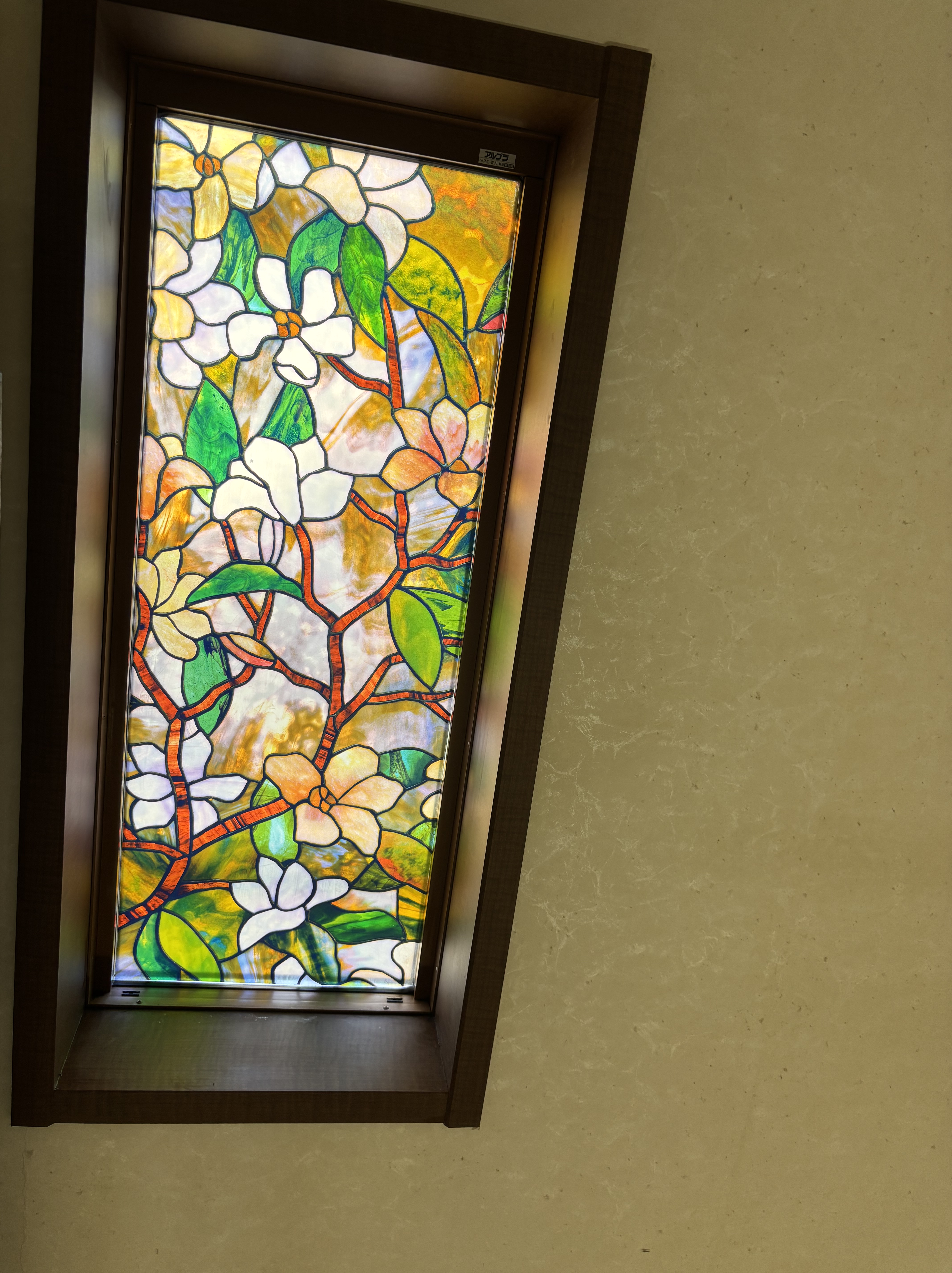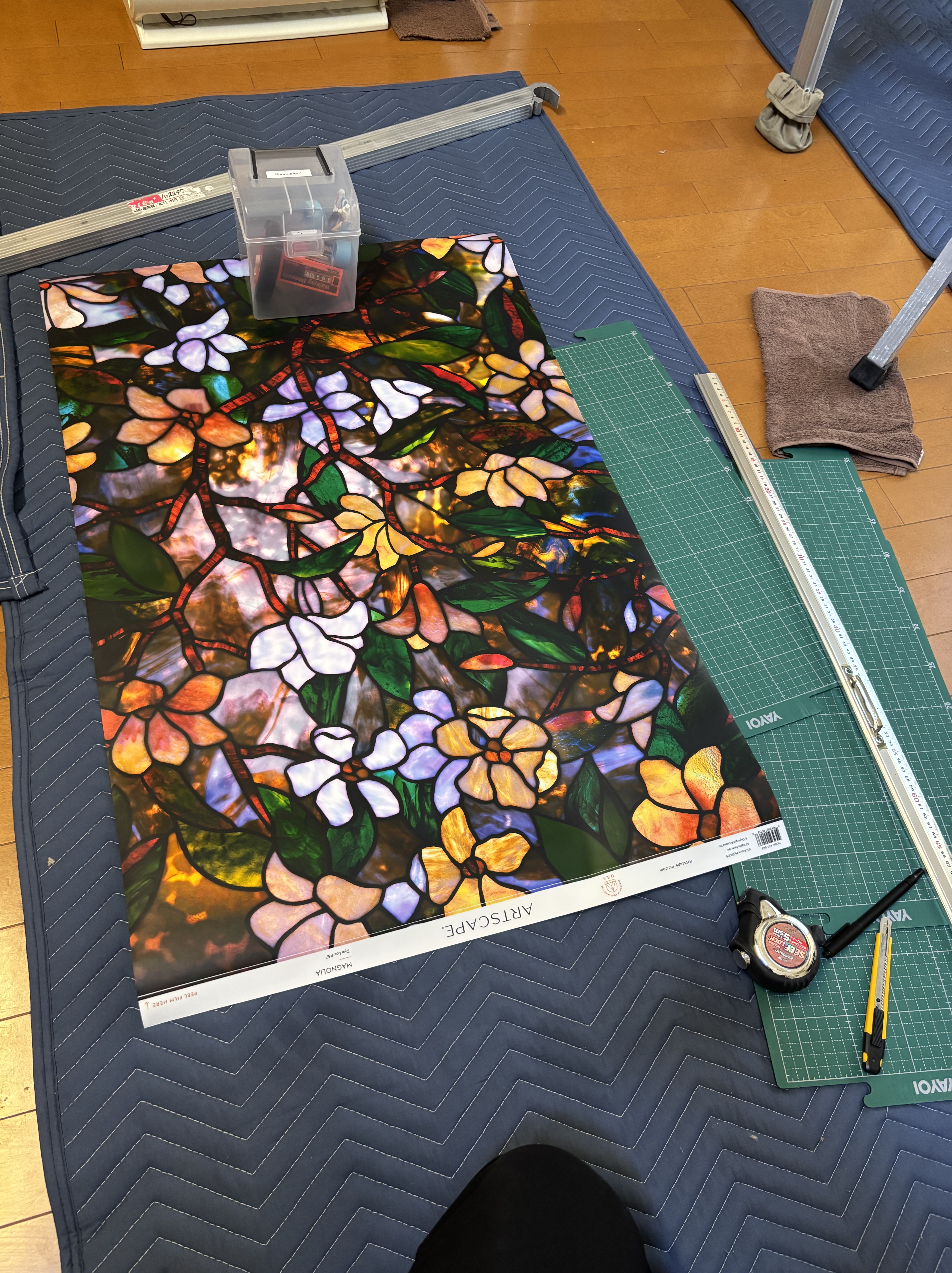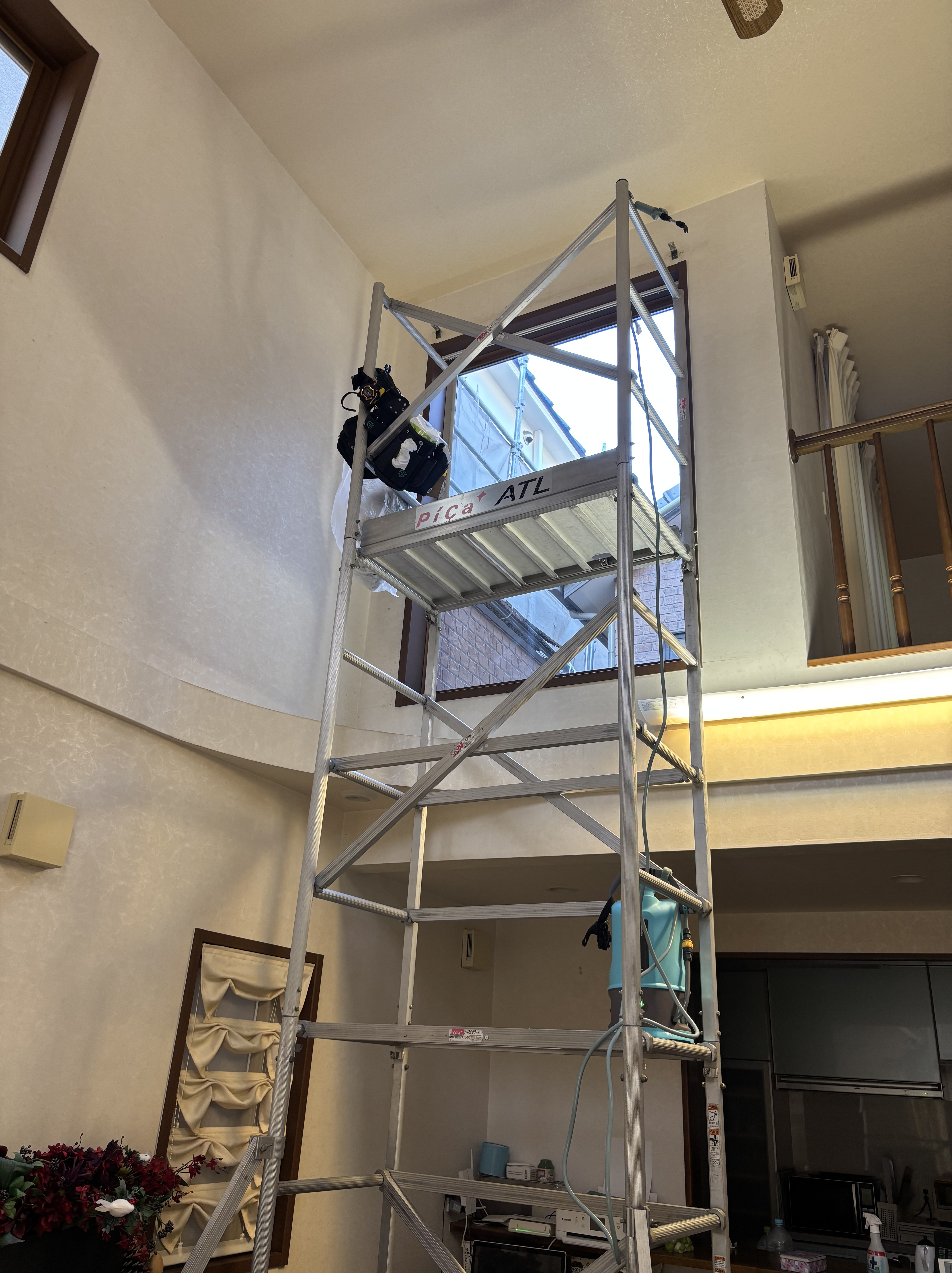 吹き抜け窓に、ネットで見つけ気に入ったステンドグラス調フィルムを貼って欲しいとのご依頼をいただきました。簡易足場を組立て、施工させていただきました。