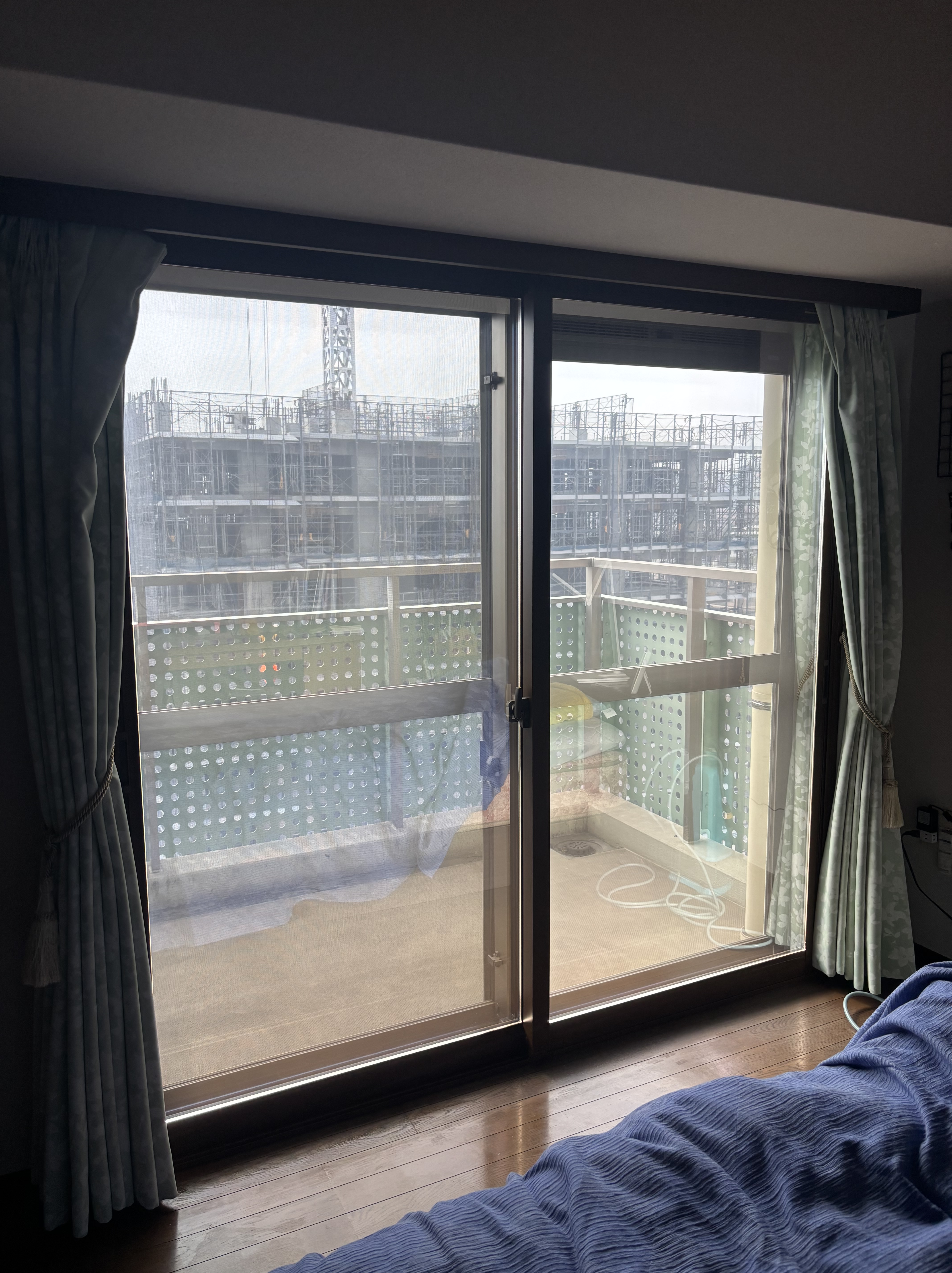駅前の隣地に大きなマンションの建設で、工事の方の視線が感じ、完成後も解決できないまま生活するのが嫌で、ミラーフィルムを貼りたいとのご依頼をいただきました。若干、隣地と距離が合ったので、ハーフミラーを提案し施工させていただきました。