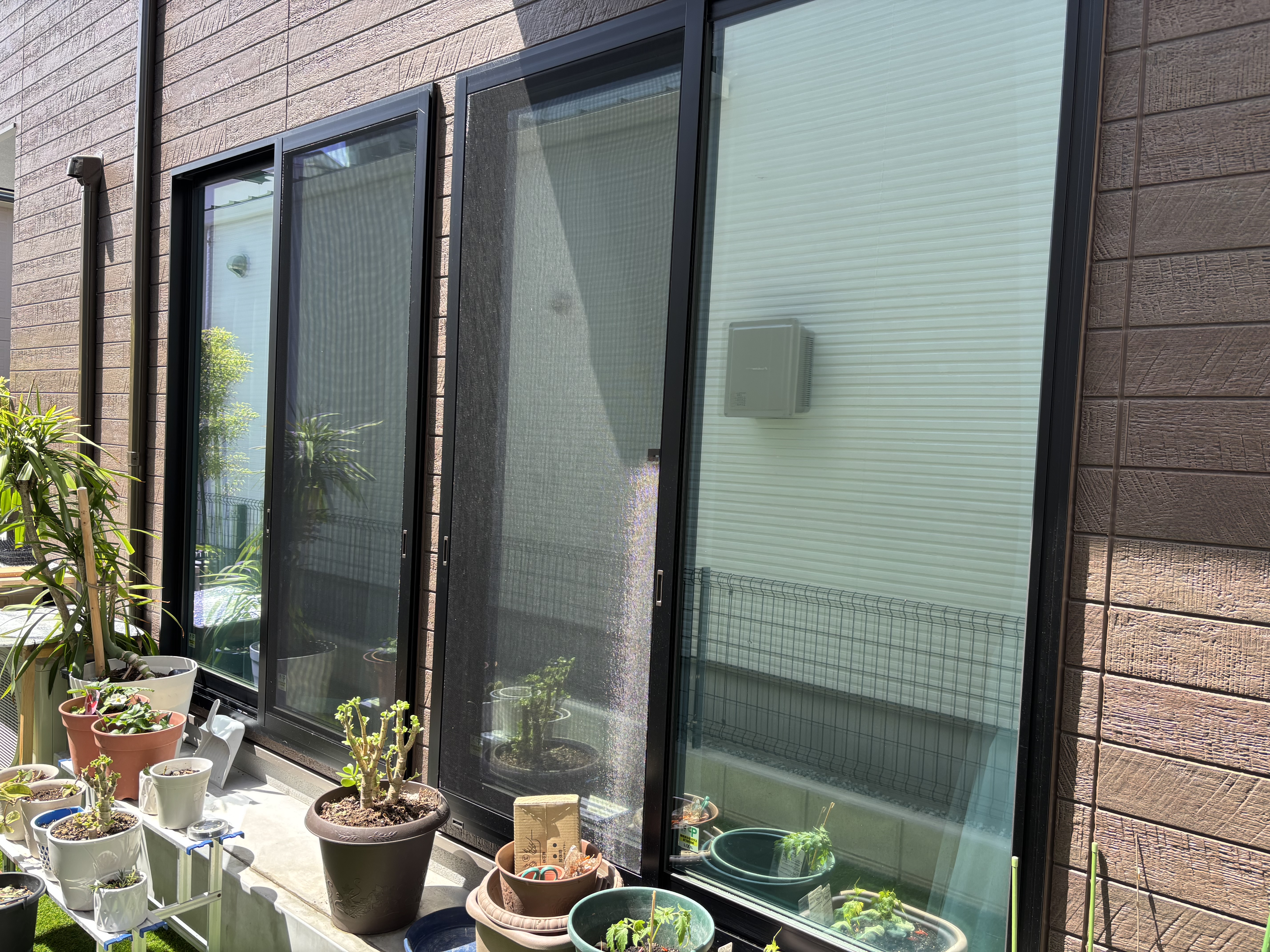日中、部屋の中の眩しさ、暑さを軽減されたいと、ミラーフィルム施工のご依頼をいただき、1階2階の南&西全ての窓にミラーフィルムを貼らせていただきました。少し水色味がかかりますが、それが逆に良いとの感想をいただきました。既に暑くなってきており、貼った面と貼っていない面で凄く差が分かる程、ミラーフィルムの遮熱性能は高いです。