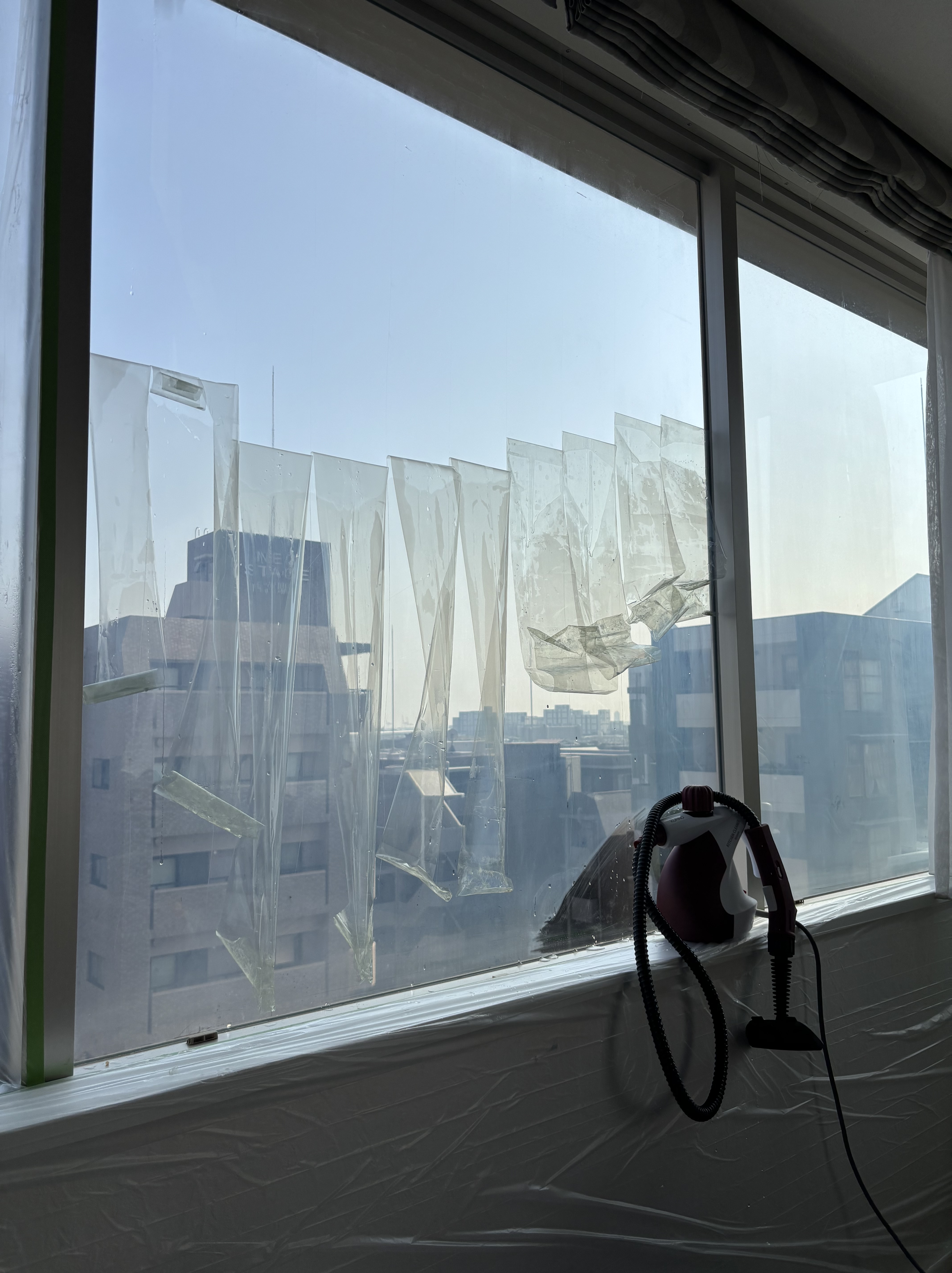 「窓のお掃除をするたびに白くなるのですが、これはフィルムの影響でしょうか?」とご相談をいただきました。前の住人さんが貼られたフィルムが劣化して白く濁り始めていましたので、剥がさせていただきました。