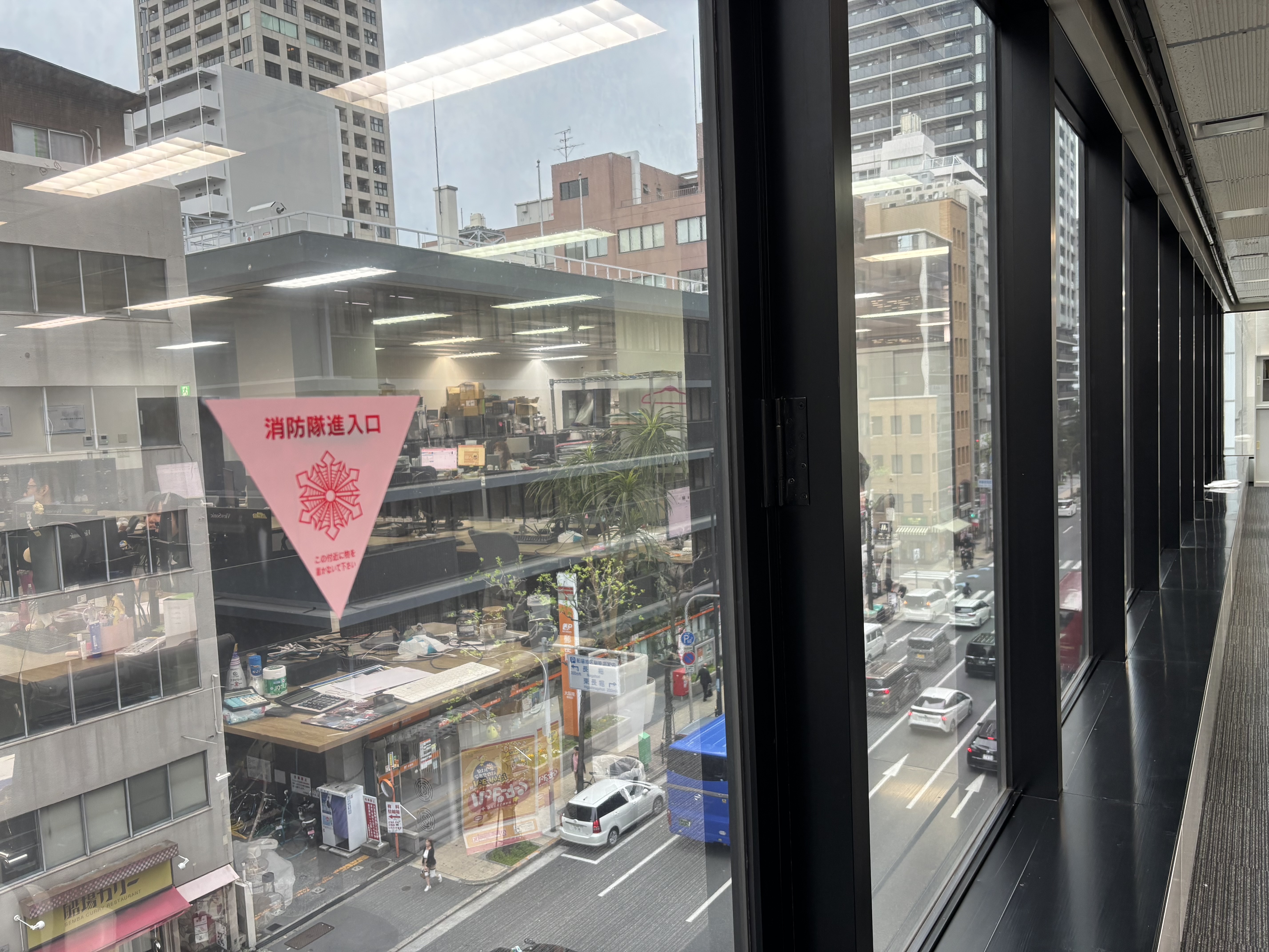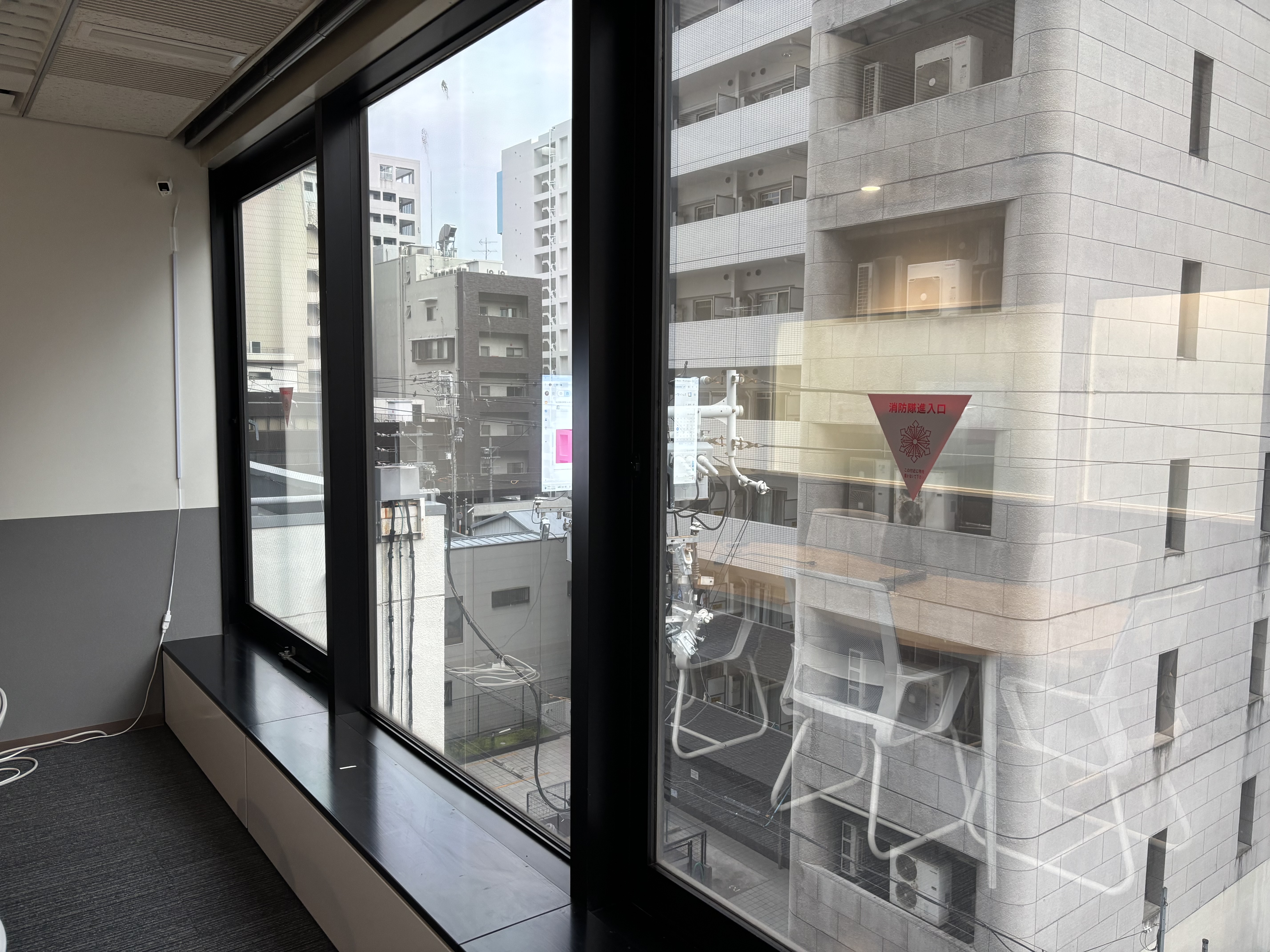 ガラスに囲まれたオフィスなので暑さが半端ないとご相談をいただきました。管理ビル様へ確認し、ミラーフィルムの施工でも問題ないとのことでしたので、遮熱性能が極めて高いフルミラーフィルムをご提案し施工させていただきました。約75㎡程あり、時間も限られていましたので、協力会社様にも手伝っていただき完了しました。消防隊侵入シールもかなり劣化していた為、剥がした後、新しいシールをフィルムの上から貼らせていただきました。