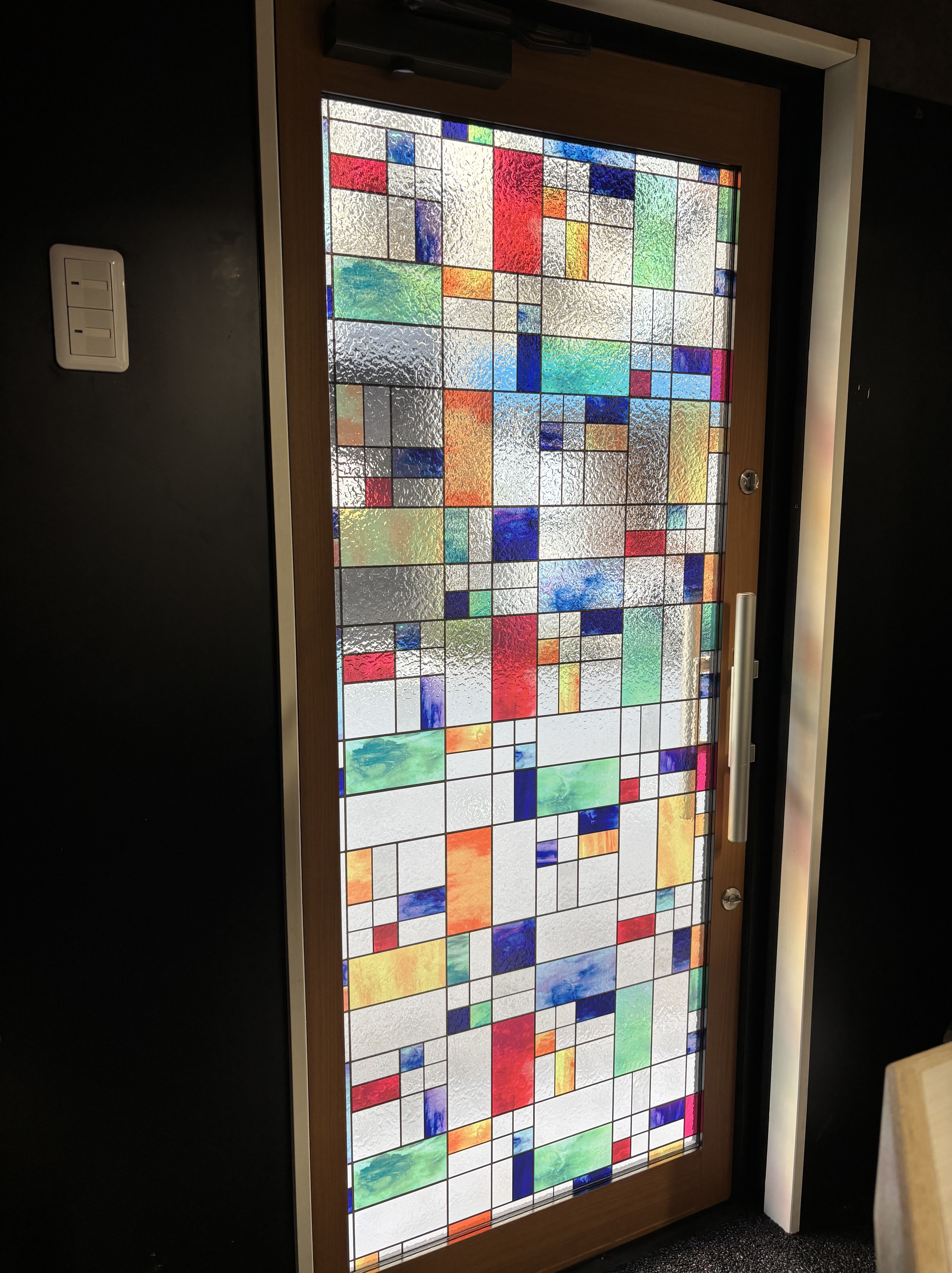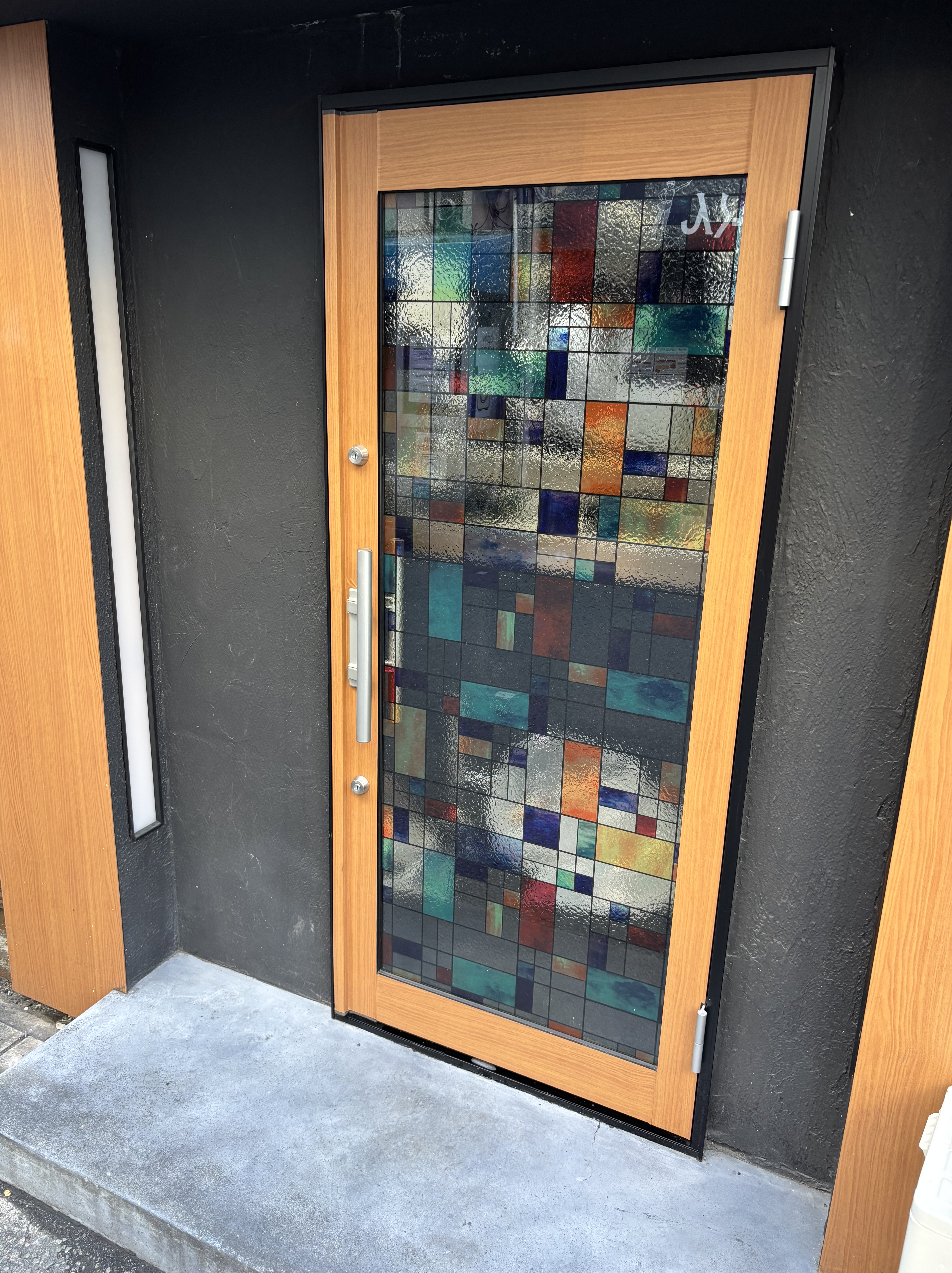 新店舗玄関ガラスにステンドグラス調フィルムを貼りたいとのご相談をいただきました。場所的に外国の方の通行も多く、目にとまるようなフィルムにされたいとのことでした。