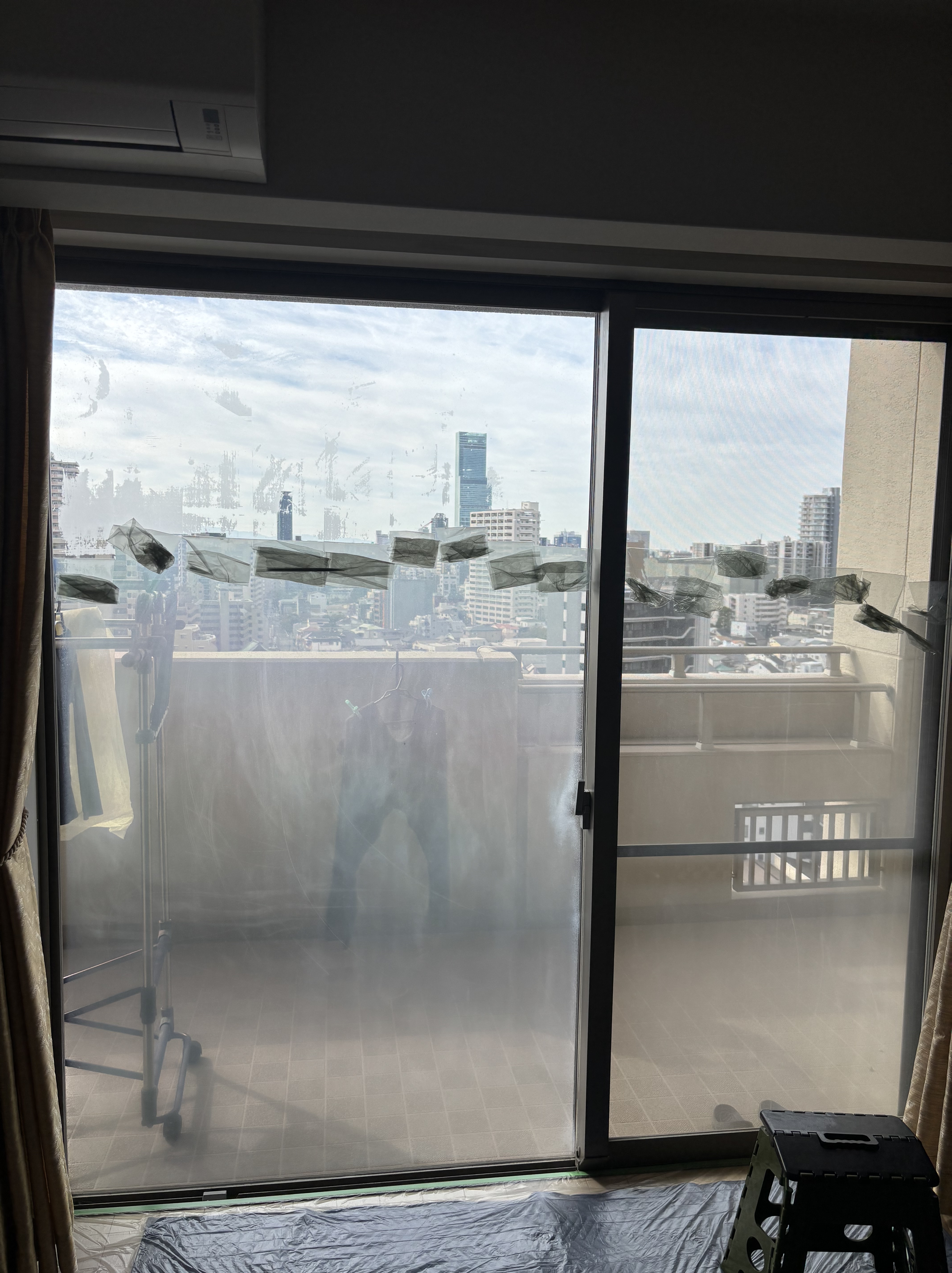 ご自宅窓に貼ってあるフィルムが劣化している為、貼り替えのご依頼をいただきました。フィルムは劣化し始めると当然、遮熱性能や紫外線カット率は低下します。既設フィルム剥離後、透明遮熱フィルムを貼らせていただきました。