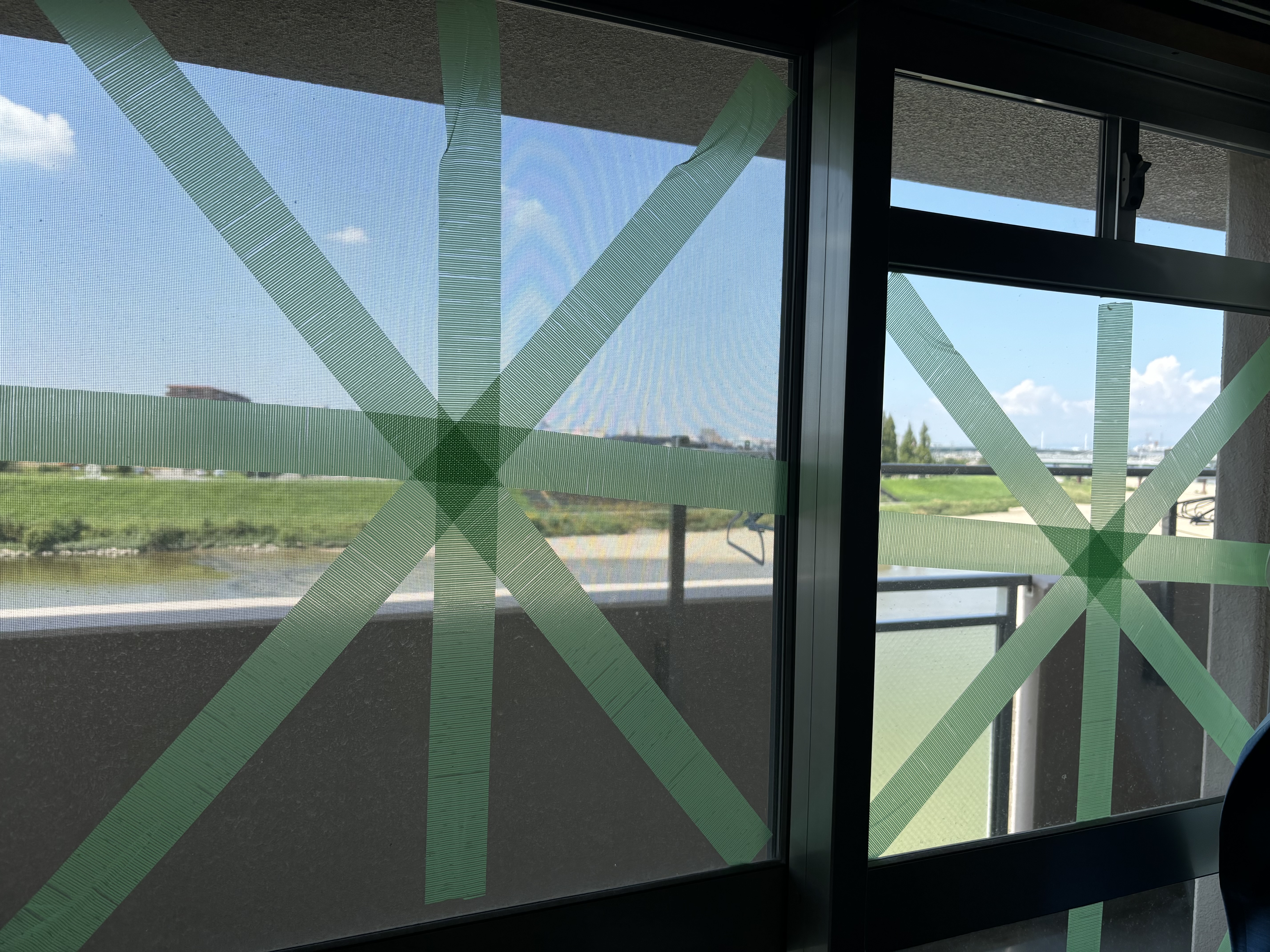 ニュースで大きな台風が来る前に飛散防止フィルムを貼った方が良いとの報道をご覧になられ、当店にご相談いただきました。お伺いさせていただきますと、各窓に養生テープがびっしり。まずはその養生テープを剥がすところから行い、飛散防止フィルムを貼らせていただきました。ネットやTVでよく耳にする「ばってんに貼った養生テープ」ですが、Youtubeの検証動画でもいっぱいあがっている通り、全く意味がないです。ネットもそうですが、未だにTVでも平気で間違った報道がされています。